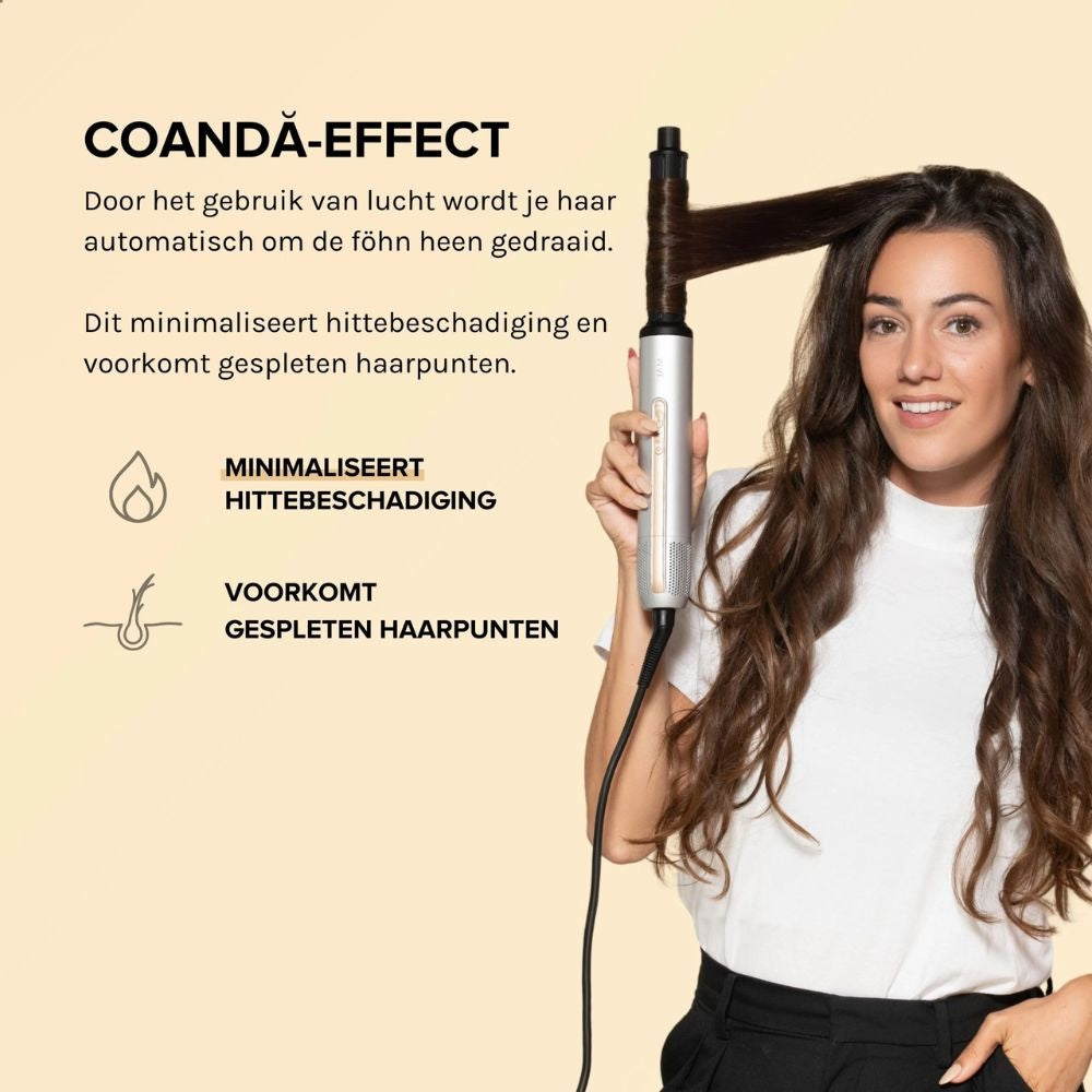 Met de MAE Airstyler II Pro geef je jouw haar een make-over die net zo professioneel oogt als uit de salon. Deze krachtige airstyler is niet zomaar een föhn: dankzij het innovatieve Coandă-effect krult, droogt en stylet hij je haar op een zachte manier. Door negatieve ionen vermindert pluis en statische elektriciteit, en blijft je haar glanzend, gezond én zijdezacht. Kortom: een absolute musthave voor elke girl die zoekt naar dé Dyson Dupe.