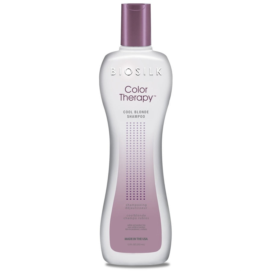 BioSilk Color Therapy Cool Blonde Shampoo er velegnet til personer med blondt hår eller hår med lyse striber. Den blonde farve forbliver smukt kølig, da varme farvetoner neutraliseres fra håret. Den fjerner også uønskede gule farvetoner fra lysblondt eller gråt hår. Som resultat sikrer denne Silver Shampoo fra Biosilk sundt, skinnende og, vigtigst af alt, levende hår. Hårfarven beskyttes mod at falme og vil derfor også blive siddende længere i håret. BioSilk Anti-Yellow Shampoo er fri for SLS, parabener og silikoner.