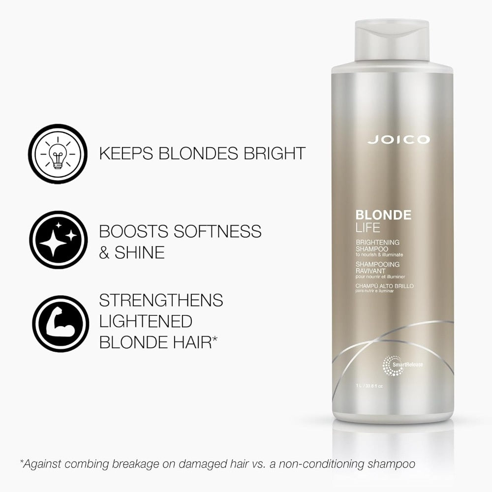 Joico Blonde Life Brightening Shampoo er specielt udviklet til blondt hår. Den luksuriøse shampoo renser håret grundigt uden at tynge det ned. Den renser således håret for klor og efterlader hårfarven strålende blond. Den milde shampoo indeholder ingen sulfater eller parabener og er yderst effektiv. Den naturlige glans i dine blonde lokker forstærkes, så du kan skinne igen!