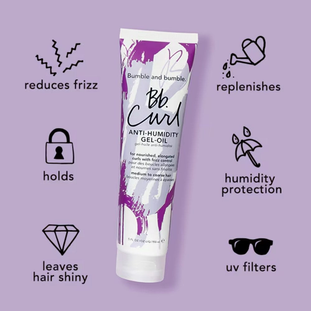 Bumble & Bumble Curl Anti-Humidity Frizz Gel Oil er en krusreducerende hårgeléolie, der giver spændstige krøller og glans. Gelen tilfører også fugt, samtidig med at den beskytter mod fugt. Formlen indeholder Hydra Sculpt Blend med brasiliansk olie og UV-filter, der beskytter håret mod skader. Produktet holder kruset hår i skak selv under de mest fugtige forhold. Desuden har den en let formel, som gør den velegnet til alle typer krøller. Tænk på bølget, krøllet og kruset hår.