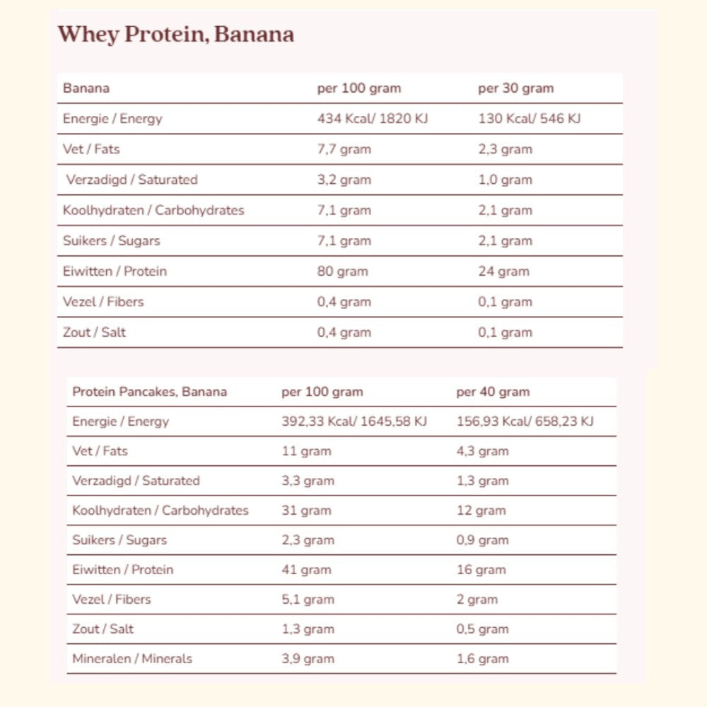 Fuldkornshavremel (gluten), hvedeprotein, valleproteinkoncentrat (mælk), æggepulver, hævemiddel: dinatriumdiphosphat, rismiddel: natriumbicarbonat, bananpulver, naturlig aroma, solsikkelecithin, sødestof: sucralose.