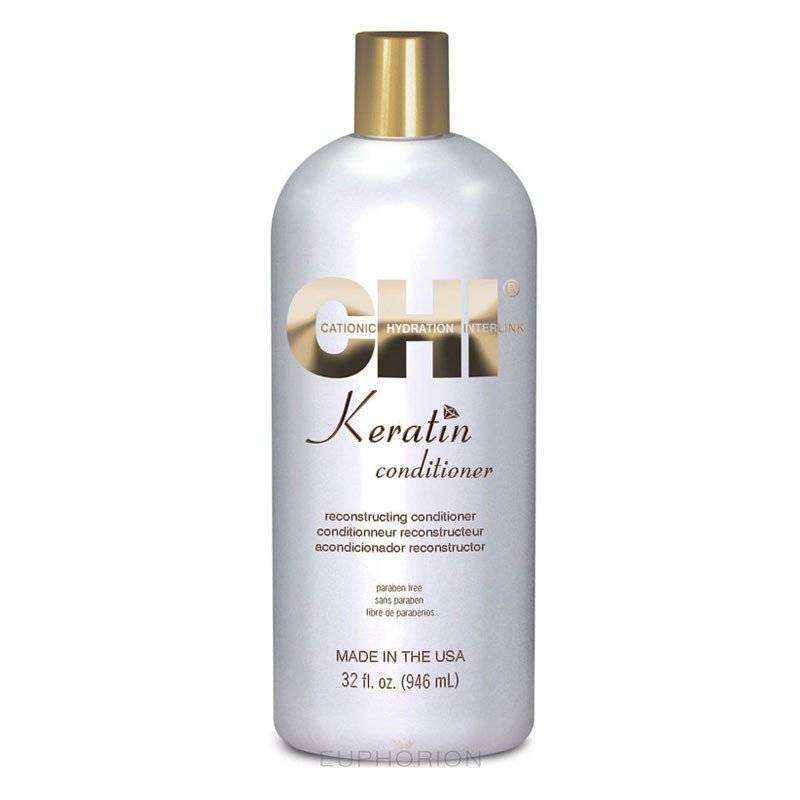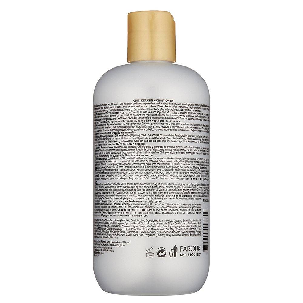 CHI Keratin Conditioner indeholder keratin, der styrker og plejer håret intensivt. Keratinen genopbygger hårets beskyttende lag og beskytter håret mod skader. De essentielle ingredienser som jojoba- og arganolie plejer hårstrået optimalt. Kombinationen af unikke ingredienser giver håret optimal pleje. Arganolie fugter håret og gør det smidigt. CHI Keratin Conditioner forebygger hårbrud og gør håret mere medgørligt. Denne balsam er fri for SLS, sulfater og parabener.