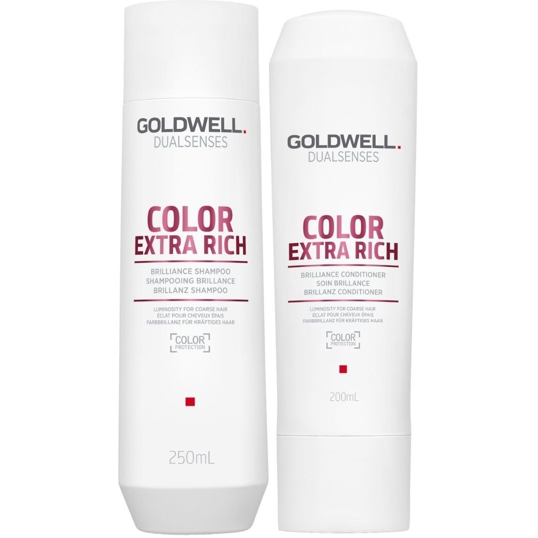 Goldwell Color Extra Rich Set er specielt til farvet hår. Det sikrer, at dit nyfarvede hår holder sig skinnende meget længere, og at farven ikke forsvinder så hurtigt. Den unikke farveteknologi sikrer et smukt og strålende resultat. Sættet består af en shampoo og en balsam: