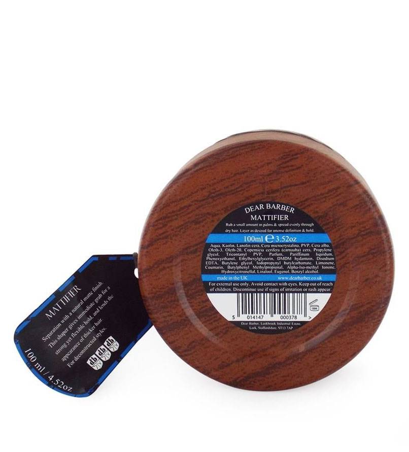 Dear Barber Mattifier griber fat i håret og skaber øjeblikkeligt et sundt og fyldigt hår. Den matte finish og det faktum, at denne styling ikke hærder, giver håret et naturligt look. De særlige ingredienser i denne Mattifier plejer også håret og forhindrer, at det tørrer ud. Fordi Mattifier er som en belægning på dit hår, beskytter den dit hår mod at optage fugt og holder dit hår i form endnu længere. Produktet har en dejlig maskulin duft og er let at vaske ud.