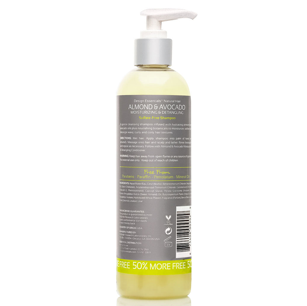DESIGN ESSENTIALS Natural Almond & Avocado Moisturising & Detangling Shampoo fås i en pakning med 237 ml.