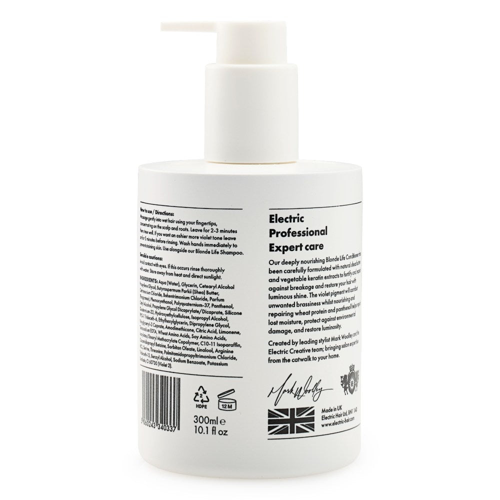 Electric P-6 Blonde Life Conditioner is een intens voedende violette conditioner die speciaal is ontwikkeld om ongewenste geeltinten in blond, geblondeerd of gehighlight haar tegen te gaan. Dankzij natuurlijke shea boter en plantaardige keratine-extracten voedt deze conditioner diep, voorkomt haar breuk én geeft je blonde lokken een prachtige, koele glans.
