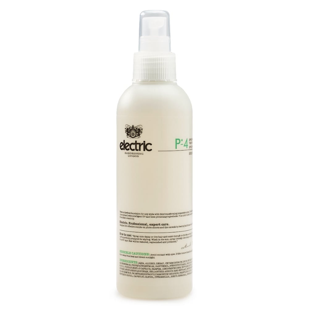 De Electric P-4 Preparation Spray* maakt je haar zichtbaar gezonder, sterker en gladder. Pluis verdwijnt als sneeuw voor de zon, klitten worden moeiteloos opgelost en je haar voelt direct gevoed en soepel aan. Bovendien is je coupe beschermd tegen hitte, uv-straling én kleurvervaging, klaar voor elke styling beurt of zonnige dag.