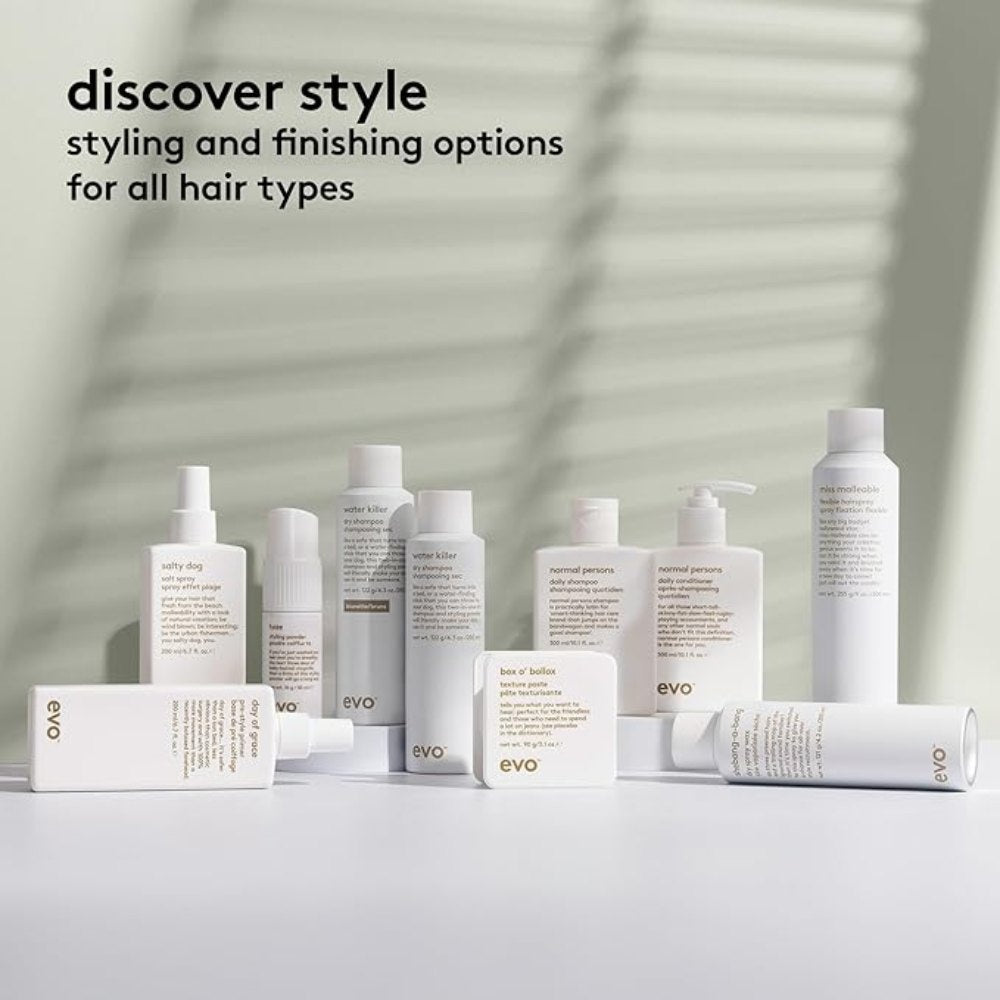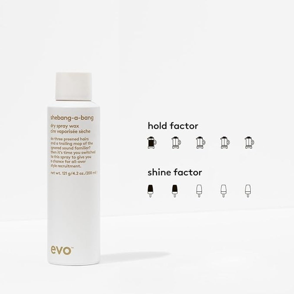 Evo Dry Spray Wax, også kendt som Shebang-a-bang, er en alsidig tør teksturspray, der giver separation, naturlig bevægelse og en mat finish i alle hårtyper. Uanset om du vil have volumen i vådt hår eller ekstra tekstur i tørt hår, giver denne spray dig en øjeblikkelig brugbar, smidig stil med et naturligt look.