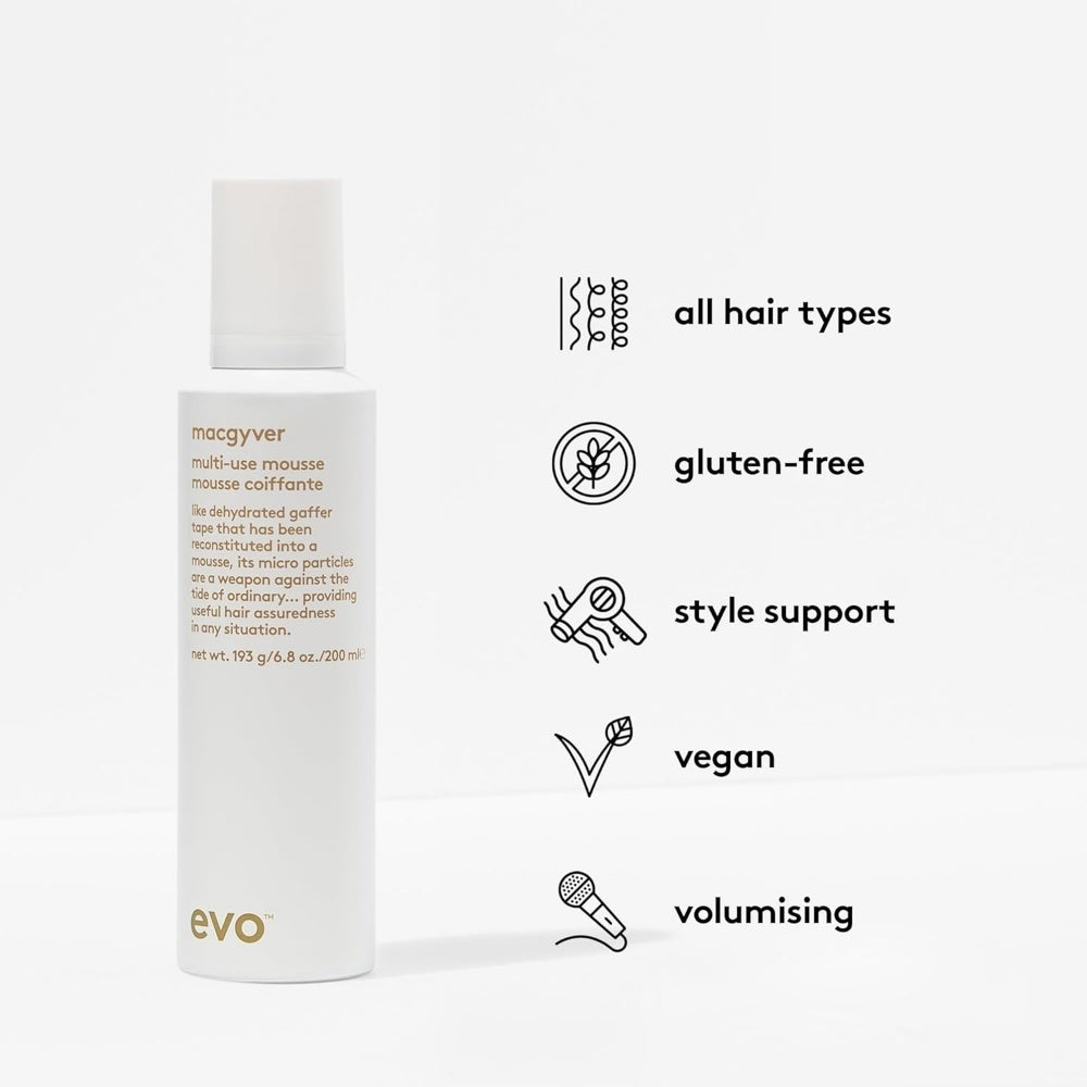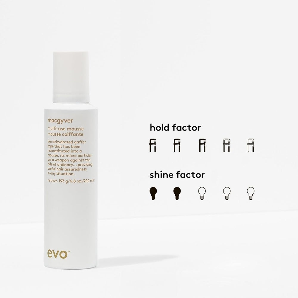 Evo Manipulating Mousse, også kendt som Macgyver, er en multifunktionel hårstylingmousse, som du kan bruge i vådt eller tørt hår, med eller uden varme, for at få øjeblikkelig volumen, separation og en tekstur, du kan røre ved. Uanset om du går efter et afslappet strandlook eller en defineret frisure med ekstra fylde, giver denne mousse dig den perfekte base samt hold.