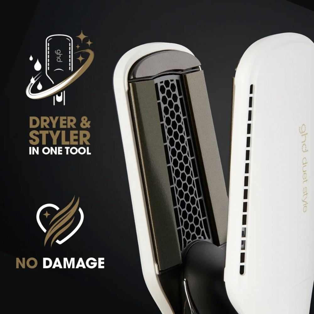 GHD Duet Hot Air Styler White er en sand game changer. Det er den første 2-i-1 varmluftstyler nogensinde, der tørrer og styler dit hår samtidig uden at det bliver beskadiget af varmen. Uanset om du har glat, krøllet, tykt eller fint hår, giver dette værktøj dig mulighed for ubesværet at skabe et krusfrit, elegant look med op til 2 gange mere glans. Takket være den smarte kombination af varmluft og innovative stylingplader sparer du tid, energi og kræfter.