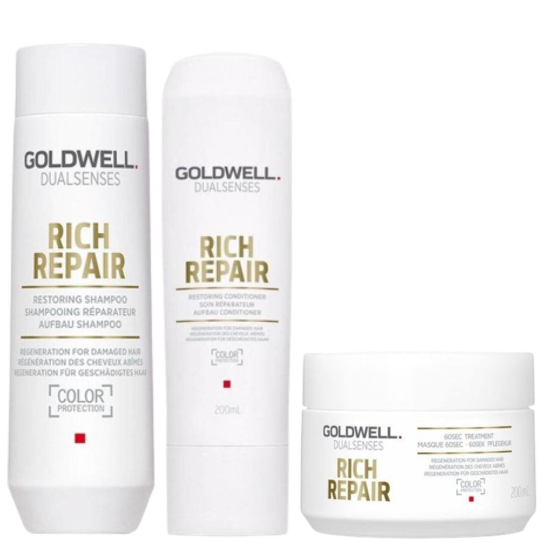Goldwell Dualsenses Rich Repair-sættet består af følgende pakker: 250ml+200ml+200ml.