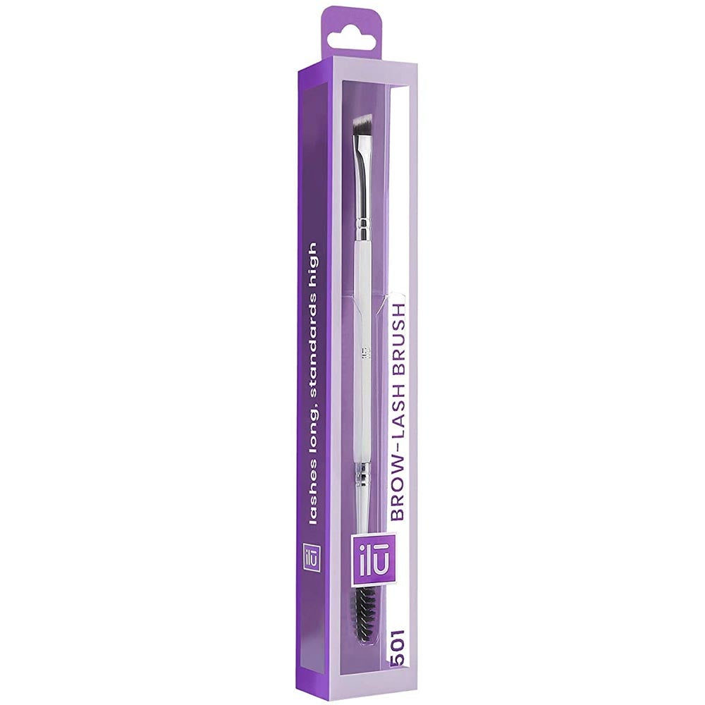 ilu Brow-Lash Brush - 501 er en dobbeltsidet børste med en spoolie på den ene side og en øjenbrynsbørste på den anden. Spoolien kan bruges til både vipper og bryn. Du kan f.eks. bruge spoolien til at børste øjenbrynene i form eller til at fjerne overskydende makeup-produkter. Med øjenbrynsbørsten kan man tegne de enkelte øjenbrynshår op, så øjenbrynene ser mere fyldige ud, eller man kan tegne brynene op for at få et slankt resultat. ilu Brow-Lash Brush er ridsefast og nem at rengøre.