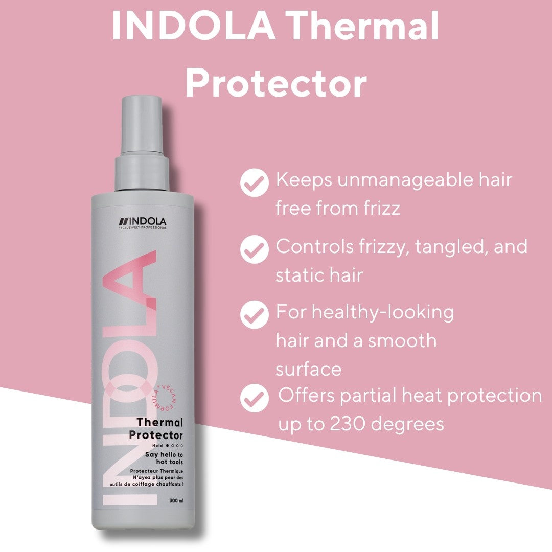 Brug Indola Thermal Protect Spray før føntørring eller styling af dit hår for at beskytte det mod varme.