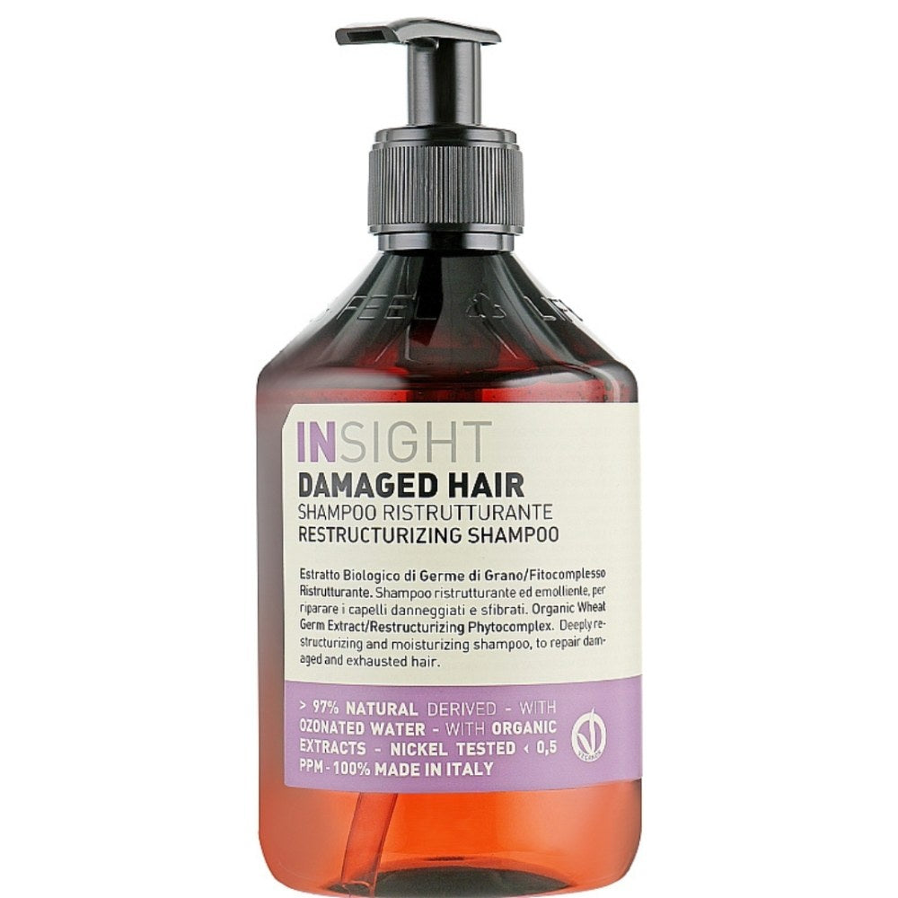Insight Damaged Hair Restructurising Shampoo er en shampoo, der kan genoprette håret og sikre, at det efterlades skinnende og blødt. Shampooen har en nærende formel, der er rig på aktive ingredienser og efterlader håret lyst, elastisk og voluminøst igen efter brug. Shampooen blødgør hårfibrene og forbedrer glansen. Shampooen er ideel til beskadiget, stresset hår og forbedrer dets tilstand. Formlen er beriget med økologisk hvedekimekstrakt og genopbyggende fytokompleks. Dette består af olivensmør, arganolie og risklidolie. Som alle Insights produkter er shampooen fri for mineralolie, parabener, farvestoffer, silikoner og allergifremkaldende duftstoffer. Desuden er alle Insights produkter veganske og nikkeltestede.