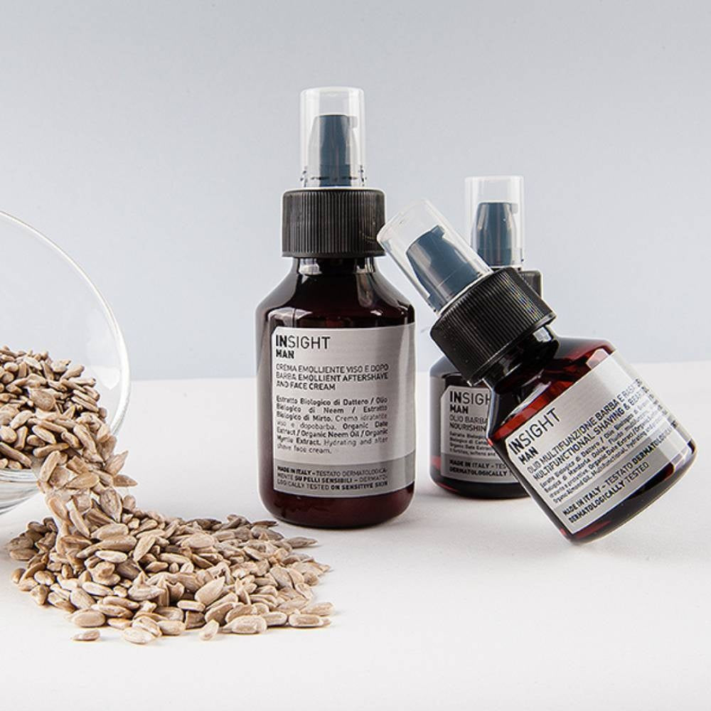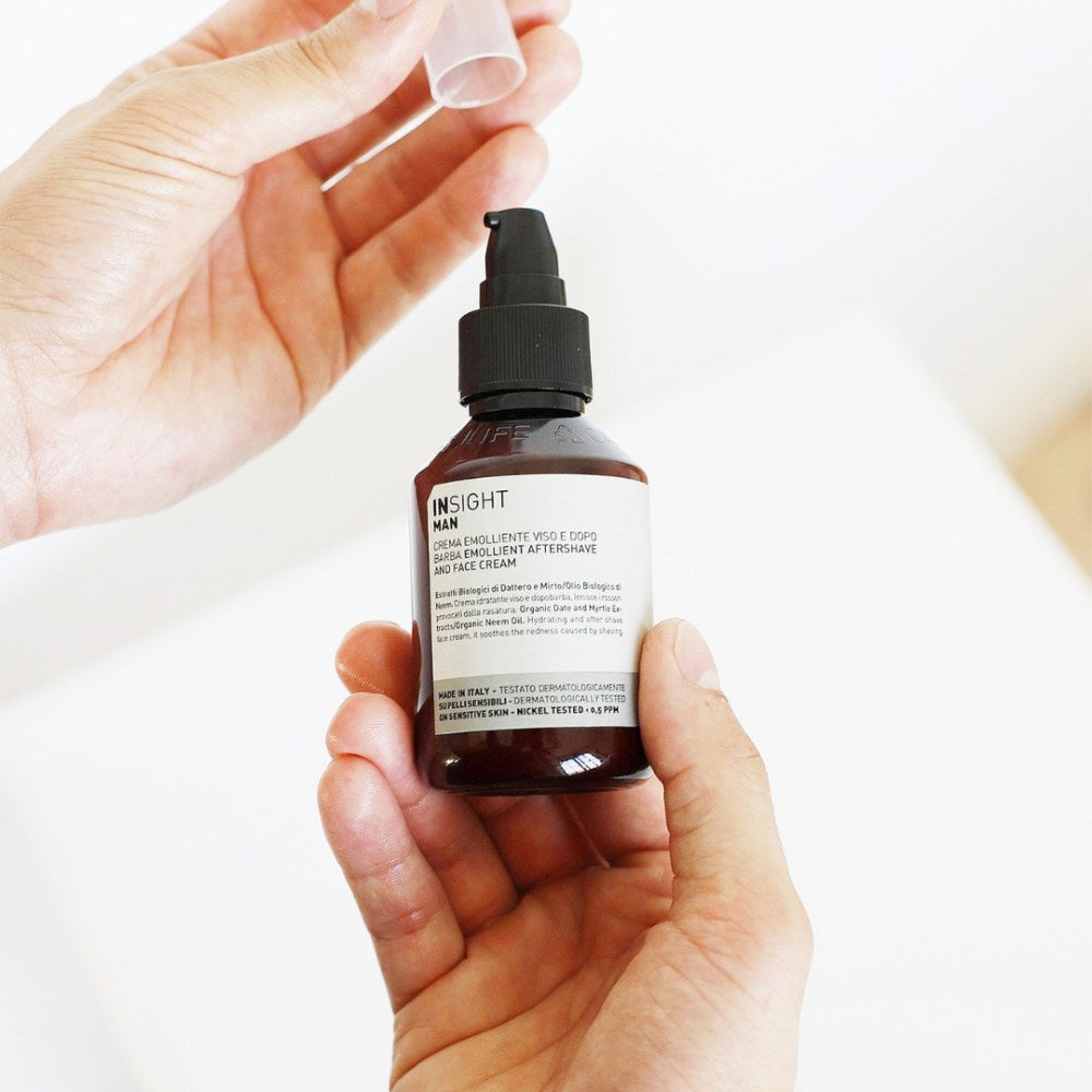 Insight Man Emollient Aftershave & Face Cream er en beroligende lotion med en fugtgivende effekt. Den genopretter hudens hydrolipidlag efter barbering uden at fedte. Produktet er specielt udviklet til alle hudtyper, selv den mest krævende og følsomme hud. Lotionen beroliger hudirritationer og er velegnet til daglig fugtning. Aftershave & Face Cream er beriget med økologisk dadelekstrakt, økologisk neemolie og økologisk myrteekstrakt, som virker beroligende og plejer huden efter barbering. Alle Insight-produkter er nikkeltestede, fri for parabener og silikoner og 100 % veganske.