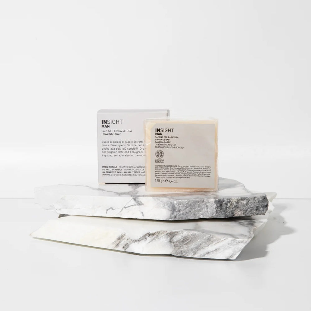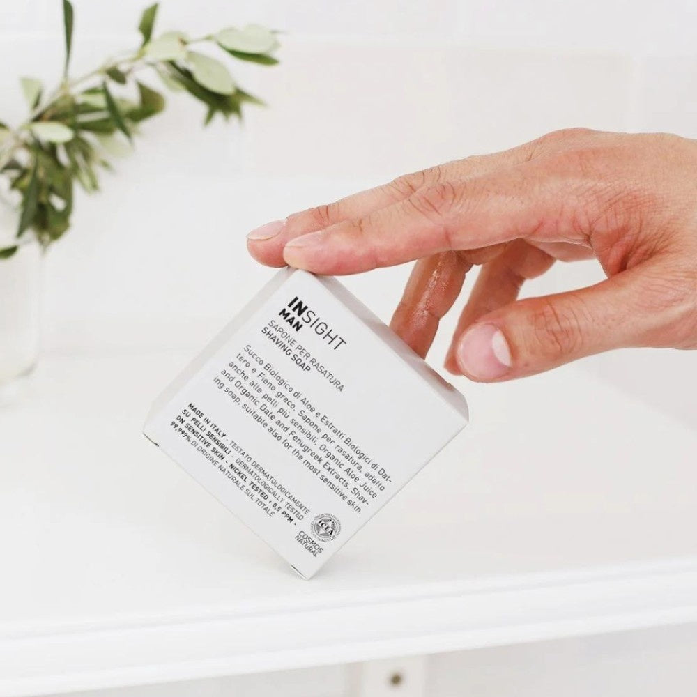 Insight Man Shaving Soap er en fast sæbe til mænd, der er ideel til en perfekt barbering takket være sin formel, der er rig på ingredienser med blødgørende egenskaber. Barbersæben er et must-have til selv det tykkeste skæg. Barbersæben er 100 % vegansk og beriget med økologisk dadelekstrakt, bukkehornsekstrakt og aloe vera-juice. Disse ingredienser giver en nærende og beskyttende effekt under barberingen. Produktet er nemt at bruge og giver et velplejet slutresultat.