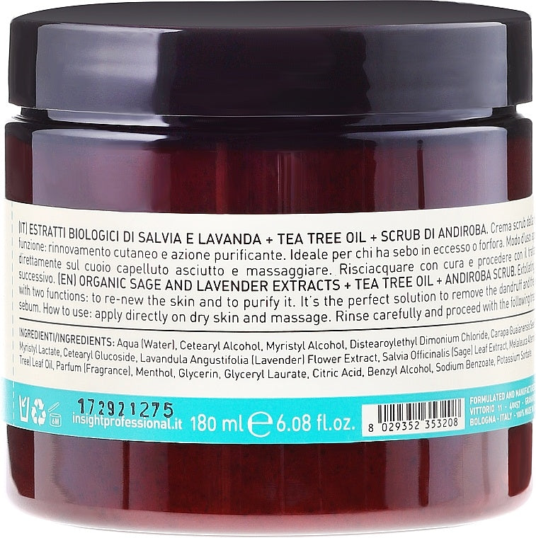 Insight Scalp Exfoliating Cream er designet til at fjerne døde celler i hovedbunden og efterladte rester. Det genaktiverer mikrocirkulationen. Hvor smukt dit hår er, afhænger også af, hvordan du plejer din hovedbund. Cremen indeholder ekstrakter af lavendel og salvie, som beroliger hår og hovedbund. Cremen indeholder også andiroba-scrub, som renser hovedbunden. Og så er der tea tree-olie med antibakterielle egenskaber. Cremen hjælper også mod skæl. Cremen er velegnet til alle hårtyper.