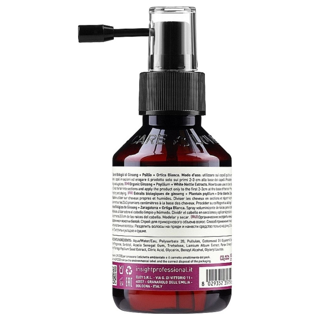 Insight Volumising Volume Up Root Lotion er en volumengivende spraylotion, der er ideel til at give volumen og fylde til fint hår. Formlen er beriget med økologiske ekstrakter af ginseng, psyllium og hvid brændenælde, der ud over volumen også giver ideel pleje og fugt til håret. Volumensprayen er beregnet til at blive påført ved hårrødderne uden at efterlade rester eller tynge håret ned. Især til tyndt, livløst hår er dette volumenboost-produkt ideelt. Med antioxidantblødgørende og stimulerende egenskaber hjælper Volume Up Root Lotion med at fremme hårvækst og styrke hårlængderne. Den unikke applikator hjælper med at målrette sprayen til hårrødderne for at opnå de bedste resultater. Det veganske produkt indeholder en mild formel, der sikrer, at håret ser skinnende og fyldigt ud.