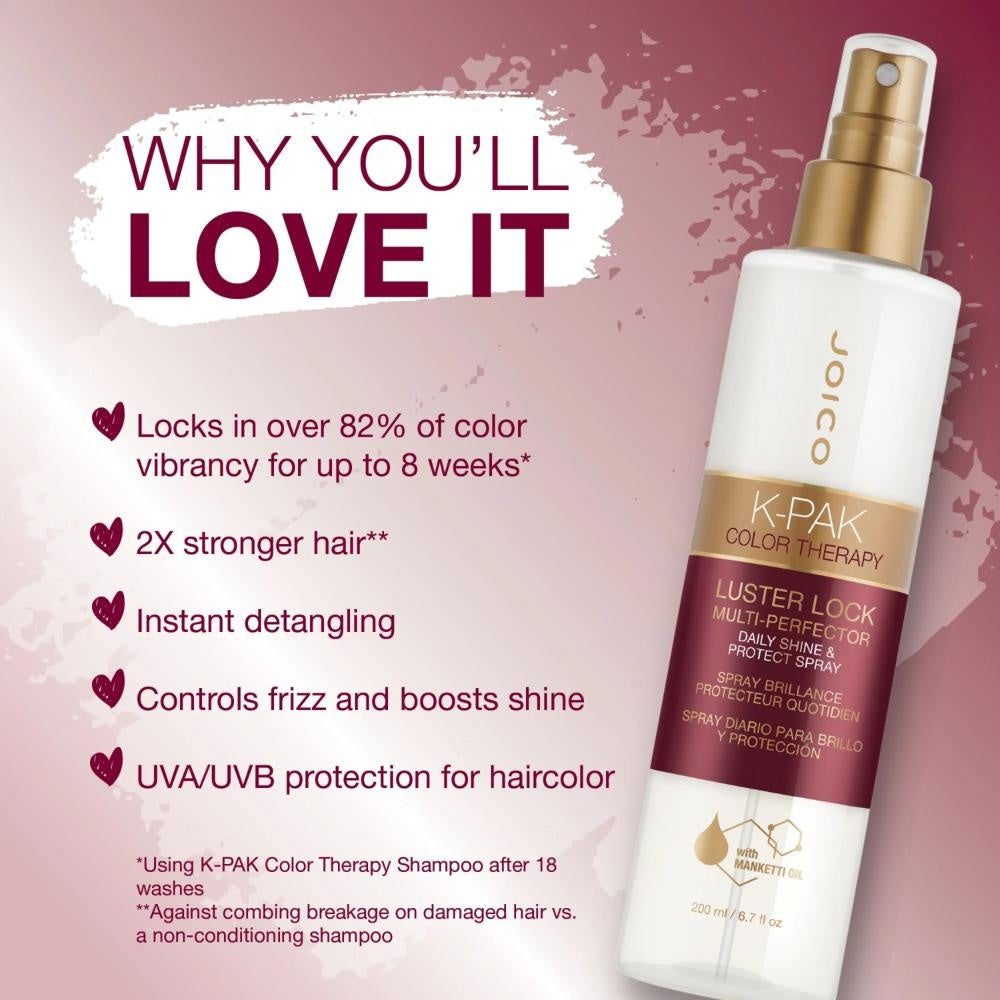K-Pak Color Therapy Luster Lock Spray er multifunktionel og kan bruges til at style håret, beskytte det, før du begynder at bruge stylingredskaber, balsamere og give glans!