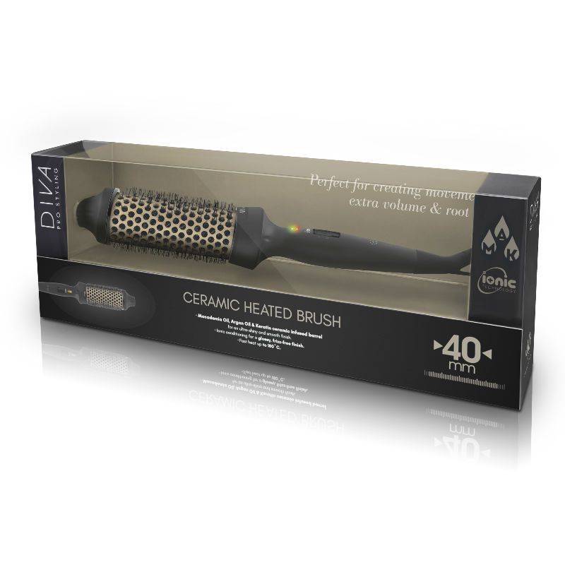 Diva Ceramic Heat Brush - 40 mm med macadamia-, argan- og keratincylinder for en glat og skinnende finish. Denne varmebørste skaber smukke krusfri bølger og krøller, som du også kan skabe med en smuk glans.