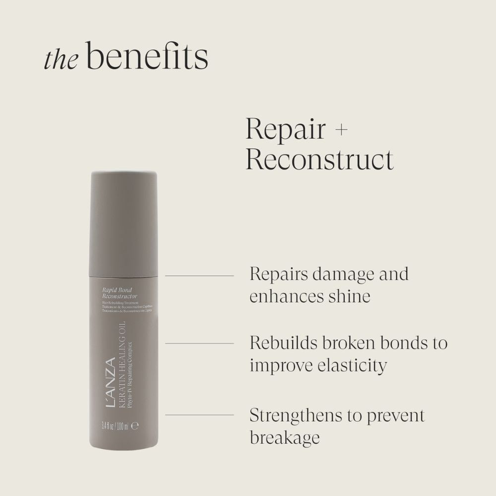 LANZA Keratin Healing Oil Rapid Bond Reconstructor er en kraftig hårbehandling, der hurtigt reparerer og styrker beskadiget hår. Denne formel er udviklet til at reparere hårfibrene, selv ved alvorligt beskadiget hår. Beriget med keratin og keratin-helende olier reparerer denne behandling hårskællene, styrker hårstrukturen og giver et silkeblødt, sundt udseende. Ideel til personer, der ønsker at reparere deres hår efter kemiske behandlinger, varme-styling eller miljøbelastninger.