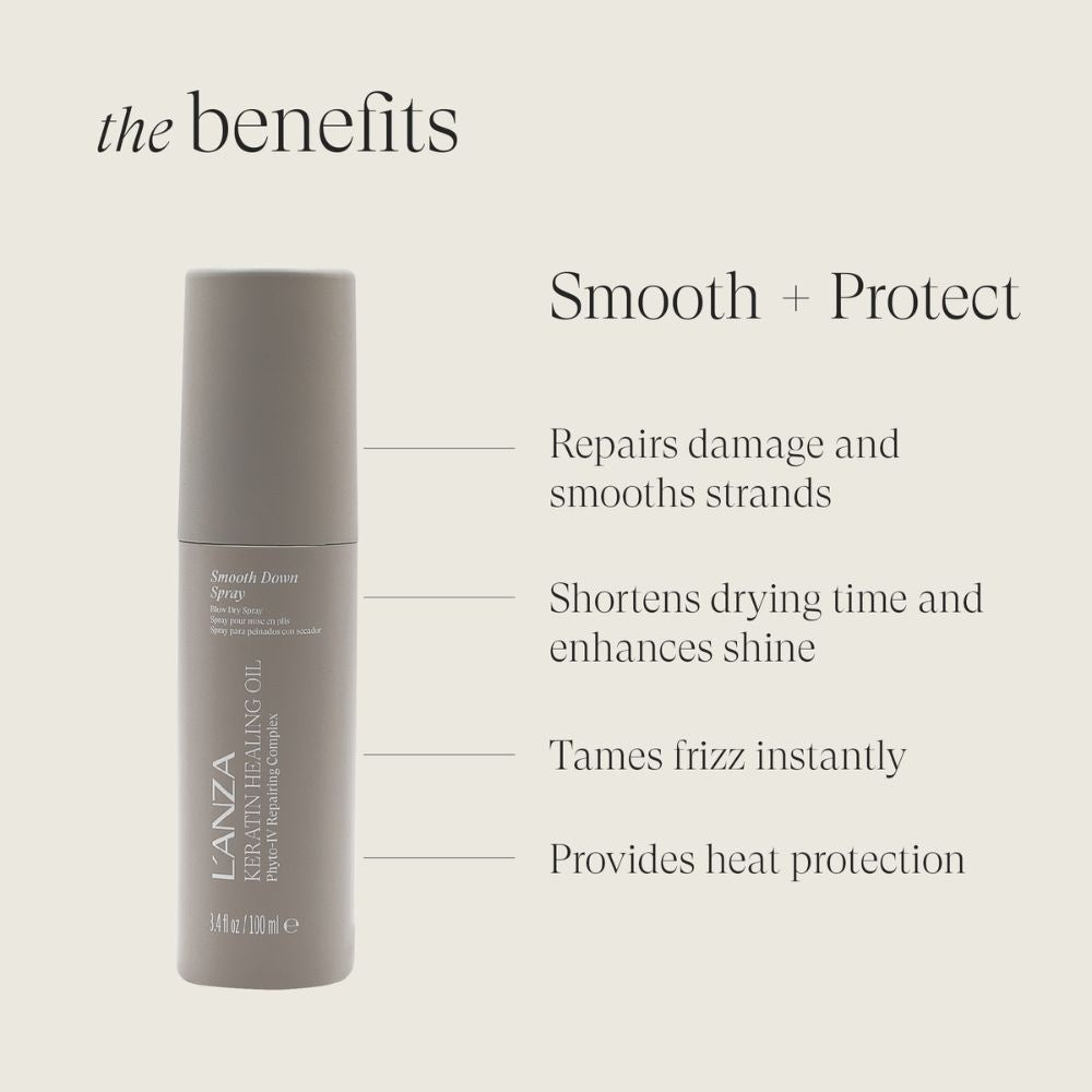 Keratin Healing Oil Smooth Down Spray giver silkeagtigt, krusfrit og glansfuldt hår. Dit hår forbliver glat, fugtet og beskyttet mod varme hele dagen, så det ser sundt og velplejet ud.