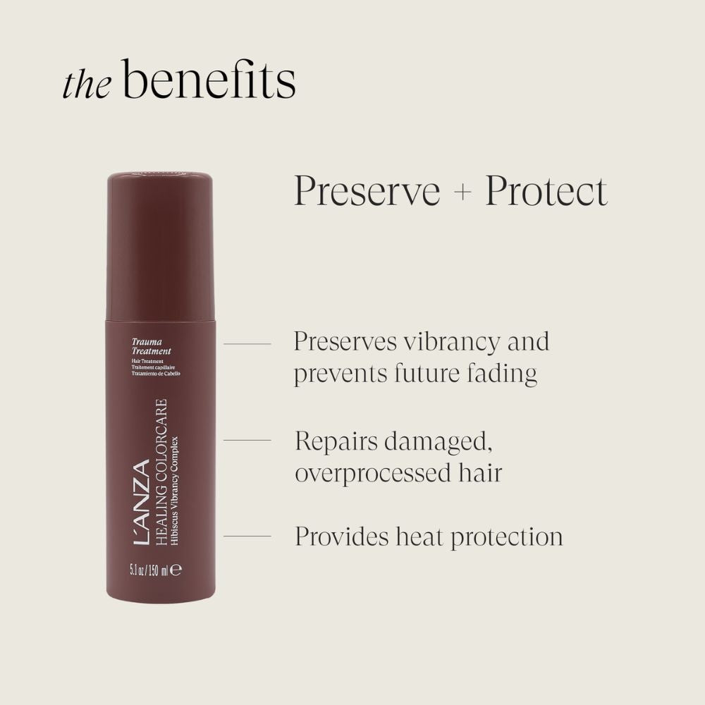 Red dit hår med LANZA Healing ColorCare Trauma Treatment, en smart leave-in/udskylningsbehandling, der reparerer beskadiget, overbehandlet hår og holder farven levende i lang tid. Denne behandling er ideel, hvis dit hår ofte er farvet, bleget eller kemisk behandlet.