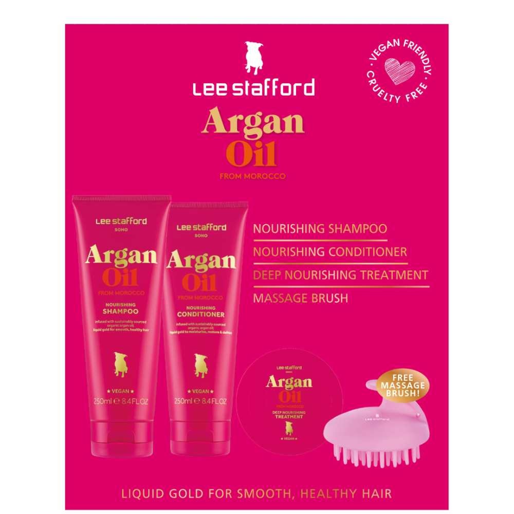 Lee Stafford Argan Oil Gift Set er det perfekte sæt til dig, der lider af tørt og skadet hår. Arganolien gør håret krusfrit, blødt at røre ved og giver dig en smuk glans. Sættet består af følgende produkter: