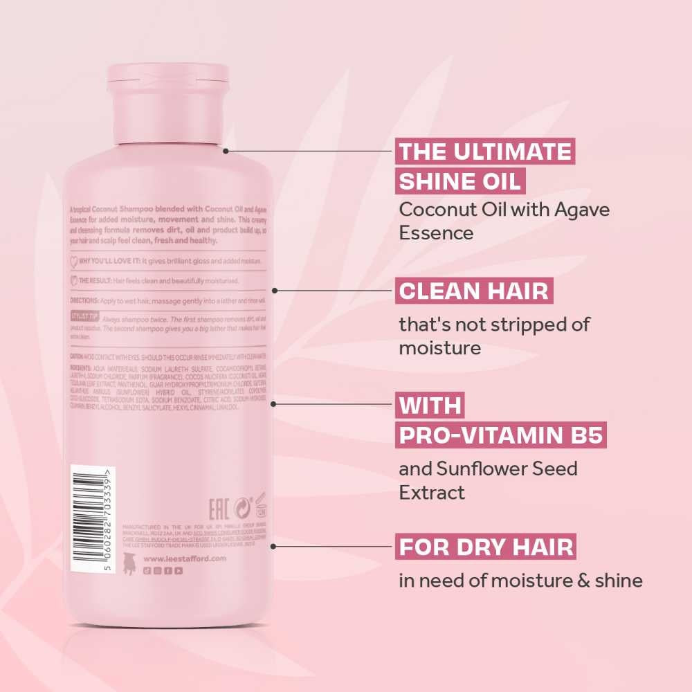 Lee Stafford CoCo LoCo & Agave Shine Shampoo er en shampoo, der giver perfekt rensning og næring til dit hår. Den giver strålende glans og silkebløde lokker. På grund af kokosolien plejes og repareres beskadiget hår. Ud over den nærende effekt giver shampooen også en vidunderlig duft af kokosolie og agave.