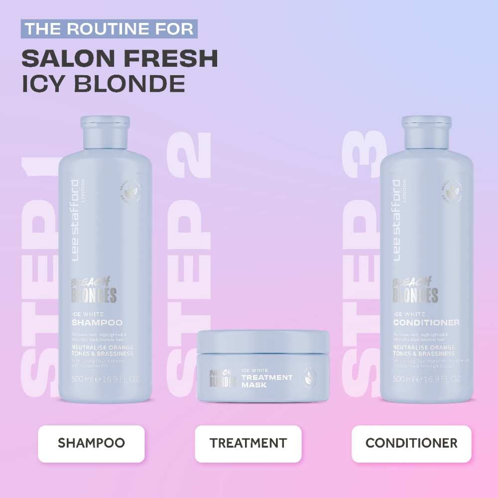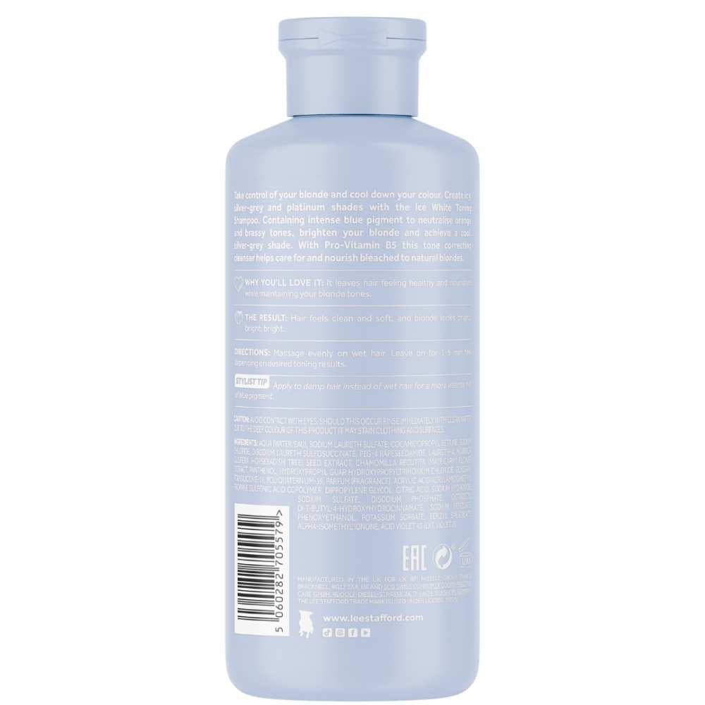 Lee Stafford Bleach Blondes Ice White Toning Shampoo er en sølvshampoo, der er specielt designet til platinblonde. Du kender det selvfølgelig; du kommer fra frisøren, og dine blonde striber er stadig perfekte. Desværre kan den varme, orange glød efter et stykke tid dukke op igen i dine blonde lokker. Heldigvis er denne silver shampoo forberedt på det! Den kraftfulde shampoo neutraliserer det irriterende orange skær og får blondt hår til at se sundt og opfrisket ud igen. Shampooen hjælper ikke kun mod den orange glød, men fugter også håret. Kan du gå ud af døren som den perfekte blondine igen ;)!