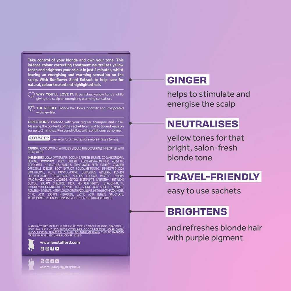 Lee Stafford Bleach Blondes Purple Tonight Hot Shots er 4 poser med lilla shampoo-pulver. Disse shots indeholder varmende ingefær og stimulerer og giver energi. Hvis du har erfaring med at blondere dit hår, ved du, at gule og orange toner kan dukke op igen efter et stykke tid. Disse shots fra Lee Stafford er farvekorrigerende og vil få dit hår til at se lyst og levende ud igen.