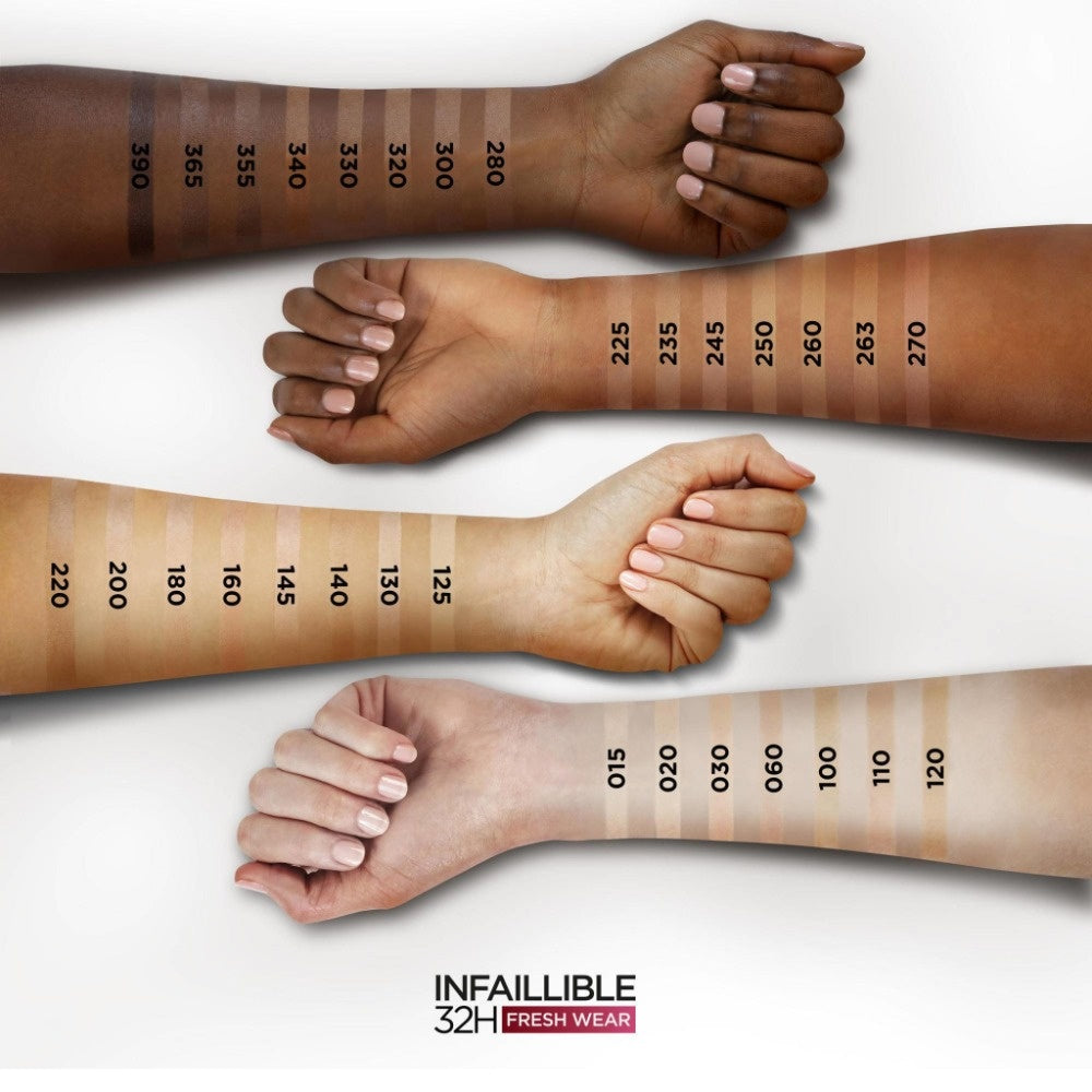 L'Oréal Paris Infaillible Foundation sikrer et langt, opfrisket og jævnt look! Med sin luftige formel føles denne langtidsholdbare Infaillible Foundation lettere og ser mere levende ud. Den unikke kombination af olier, langtidsholdbare polymerer og pigmenter skaber en let tekstur og fugt, der lader huden ånde hele dagen. Den ultratynde tekstur lader huden ånde, men giver stadig en god dækning.