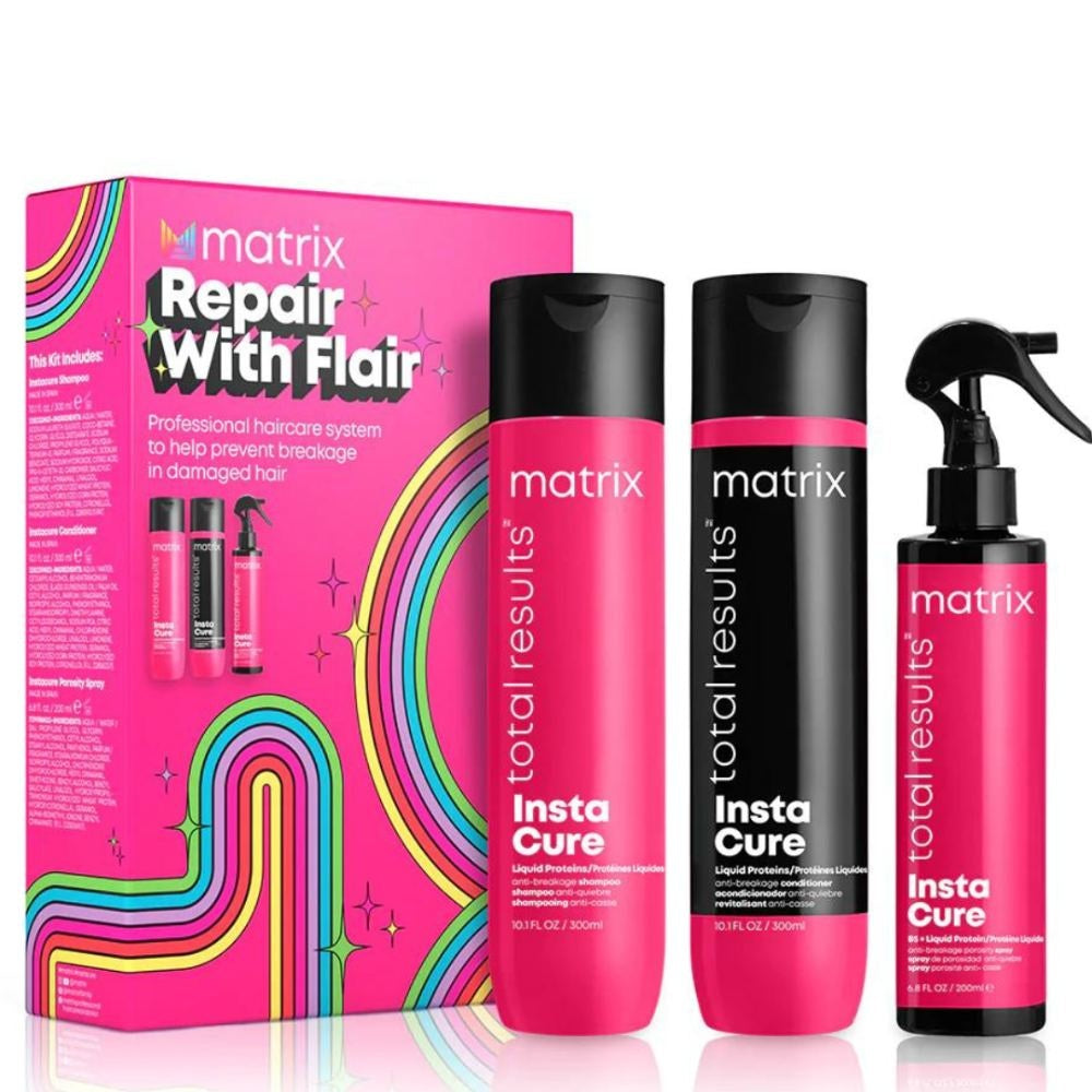 Matrix Total Results Insta Cure Luxe Trio Set renser skånsomt skadet hår. Skrøbeligt hår styrkes, og spaltede spidser reduceres. Sættet efterlader håret blødt og stærkt igen. Derudover hjælper produkterne med at rede og udrede groft og tørt hår. Sættet består af: