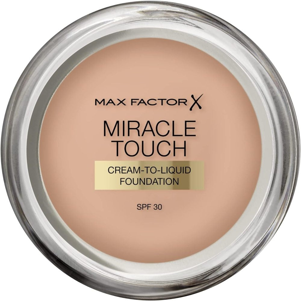 Max Factor Miracle Touch Foundation skaber den perfekte base med 1 handling. Det vil ændre din makeup-rutine for altid. Med sin unikke letvægtsformel, der skifter fra fast til flydende ved berøring af din hud, er den ideel til den perfekte base. Ved at bruge denne cremefoundation eliminerer du den traditionelle kombination af concealer, foundation og pudder. Denne foundation giver et smukt, friskt, fejlfrit og jævnt resultat. Den fornyede formel er beriget med hyaluronsyre, spf 30 og giver ultimativ hydrering, samtidig med at den reducerer risikoen for for tidlig ældning af huden forårsaget af solskader.