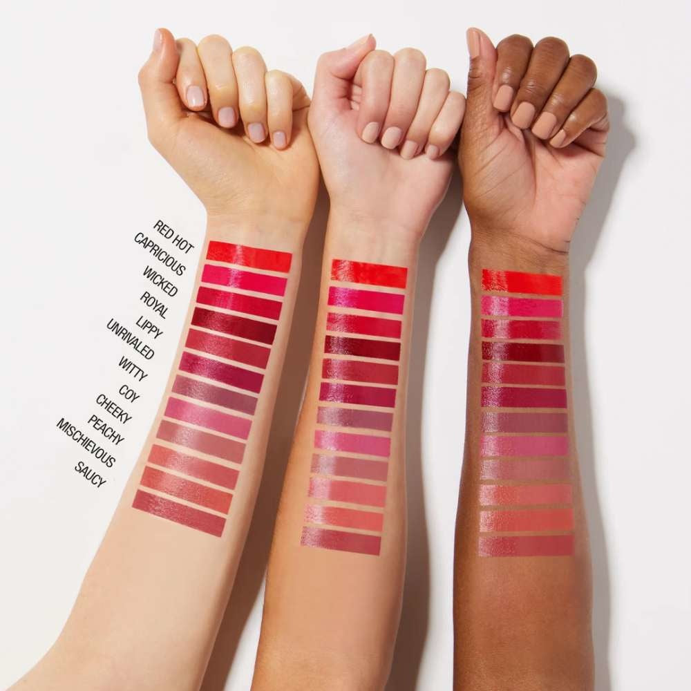 Isododecane, DIMETHICONE, Trimethylsiloxysilicate, Polymethylsilsesquioxane / Trimethylsiloxysilicate, POLYPROPYLSESQUIOXANE, C30-45 ALKYLDIMETHYLSILYL POLYPROPYLSILSESQUIOXANE, TRIMETHYLSILOXYPHENYL DIMETHICONE, TRIMETHYL pentaphenyl trisiloxane, BIS-Stearyl Dimethicone, dimethiconol, trihydroxystearin, phenoxyethanol, ALUMINA, Ethylhexylglycerin, TOCOPHERYL ACETATE, Triethoxycaprylylsilane, LIMONENE, Isopropyl Palmitate, ISOPROPYL MYRISTATE, SILICA, BENZYL BENZOATE, BENZYL ALCOHOL, CITRONELLOL, LINALOOL, ALOE BARBADENSIS LEAF EXTRACT, TOCOPHEROL, PERFUME / FRAGRANCE CI 77891 / TITANIUM DIOXIDE, CI 15850 / RED 7, CI 77491, CI 77492, CI 77499, CIRON OXIDES 45410 / RED 28 LAKE, CI 45380 / RED 22 LAKE, CI 15985 / YELLOW 6 LAKE, CI 19140 / YELLOW 5 LAKE, CI 17200 / RED 33 LAKE, CI 15850 / RED 6, CI 77742 / MANGANESE VIOLET, CI 42090 / BLUE 1 LAKE