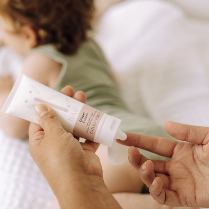 Tag lidt af Naïf Diaper Cream og smør det på barnets numse. Det er bedst at lade det lufttørre et stykke tid bagefter.