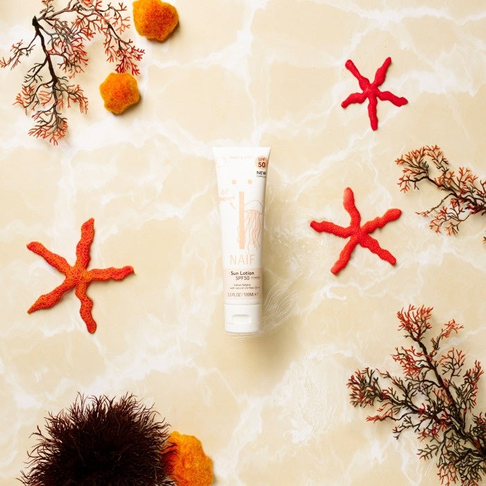 Naïf Baby & Kids Sun Lotion SPF50 er perfekt til at holde dit barns hud godt beskyttet, når solen skinner. Denne fine lotion uden blødgøringstid og uden parfume sikrer minimal risiko for hudirritation. Så den er ekstra velegnet til følsom babyhud! Sollotionen har et naturligt filter afledt af mineralet zinkoxid (ikke-nano), som danner et lag på huden. Det reflekterer straks solens stråler. Lotionen indeholder vand sammenlignet med en creme, hvilket sikrer, at den spredes let og absorberes hurtigt. Derudover er den selvfølgelig også vandfast! :)
