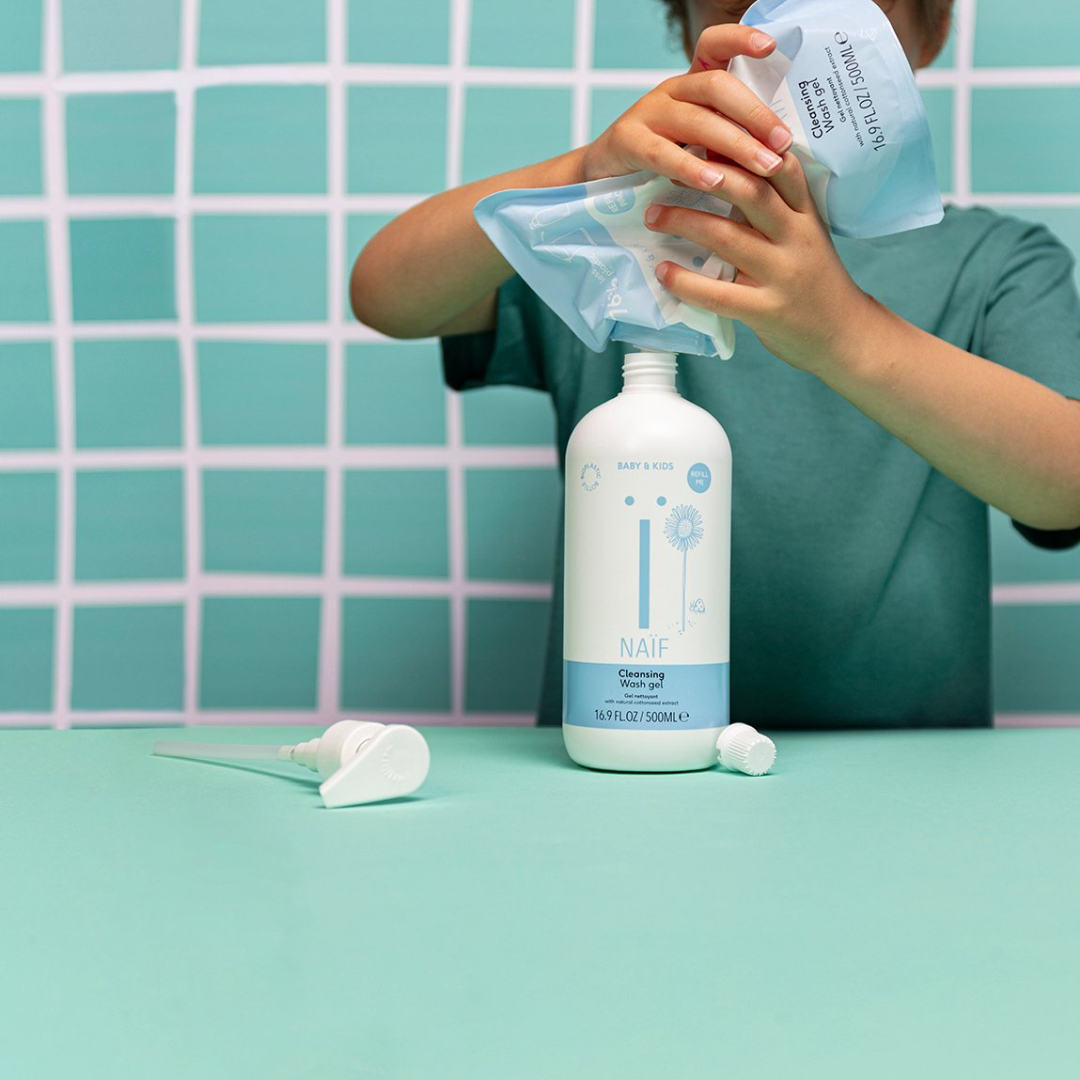 Hæld forsigtigtNaïf Cleansing Wash Gel for Baby & Kids Refill Pack i Baby & Kids Cleaning Wash Gel-flasken. Gør først barnets hud våd, og påfør derefter en lille mængde vaskegel på huden eller på en flannel. Gnid, skyl, og så er du færdig! Du kan bruge vaskegelen i badekarret eller under bruseren. Vaskegelen svier ikke i den lilles øjne. Prøv dog at undgå øjenkontakt så meget som muligt!