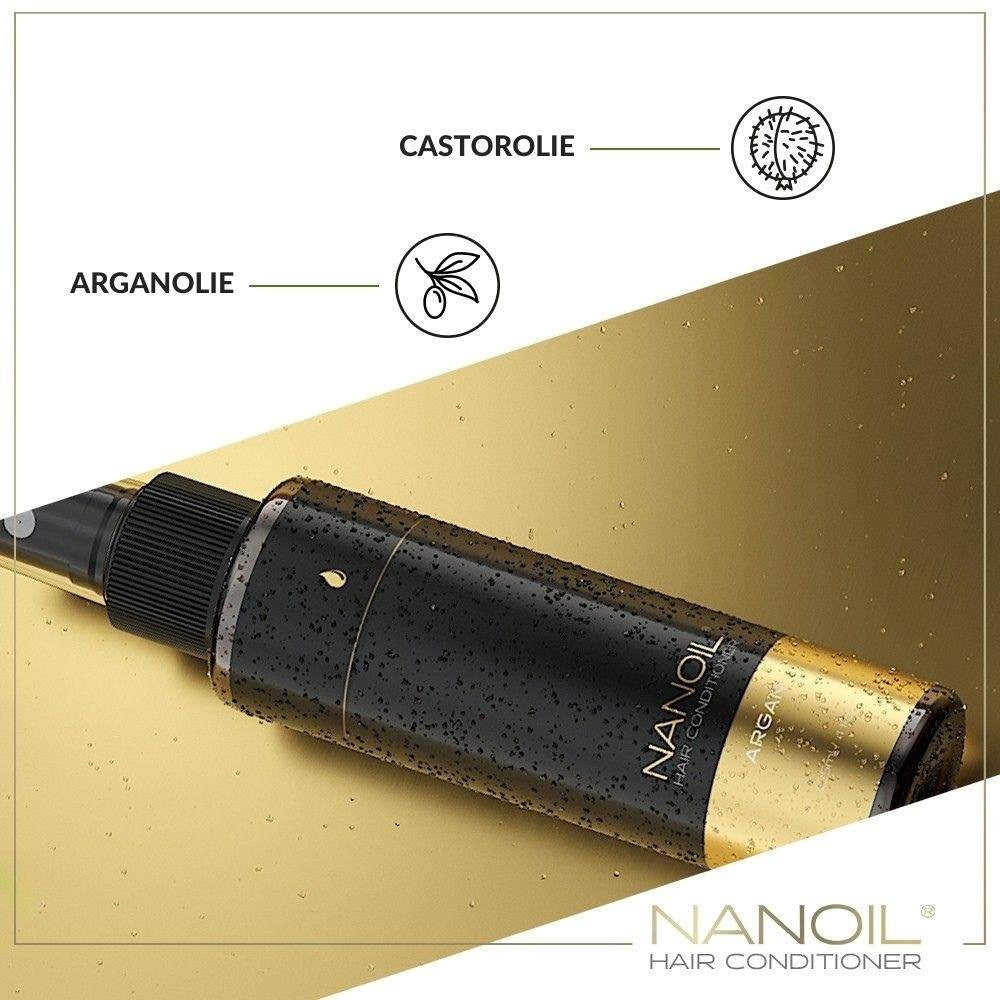 Nanoil Argan Conditioner er en hårbalsam med arganolie, som ikke behøver at blive skyllet ud. Balsammen tynger ikke håret ned og giver intensiv pleje. Balsammen er den perfekte løsning til alle hårtyper og giver kontinuerlig glans og perfekt sundhed. Beriget med arganolie og ricinusolie reducerer Argan Conditioner risikoen for skader og dehydrering. Den forebygger også sammenfiltring og gør det lettere at rede håret. Balsammen giver næring, styrkelse og genoplivning.