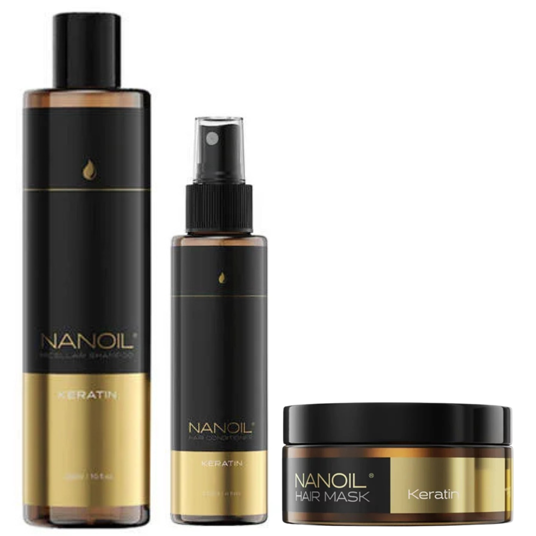 Nanoil Keratin Complete Set er et hårplejesæt beriget med keratin, specielt designet til at genoplive beskadiget, skørt og livløst hår. Sættet består af følgende produkter: