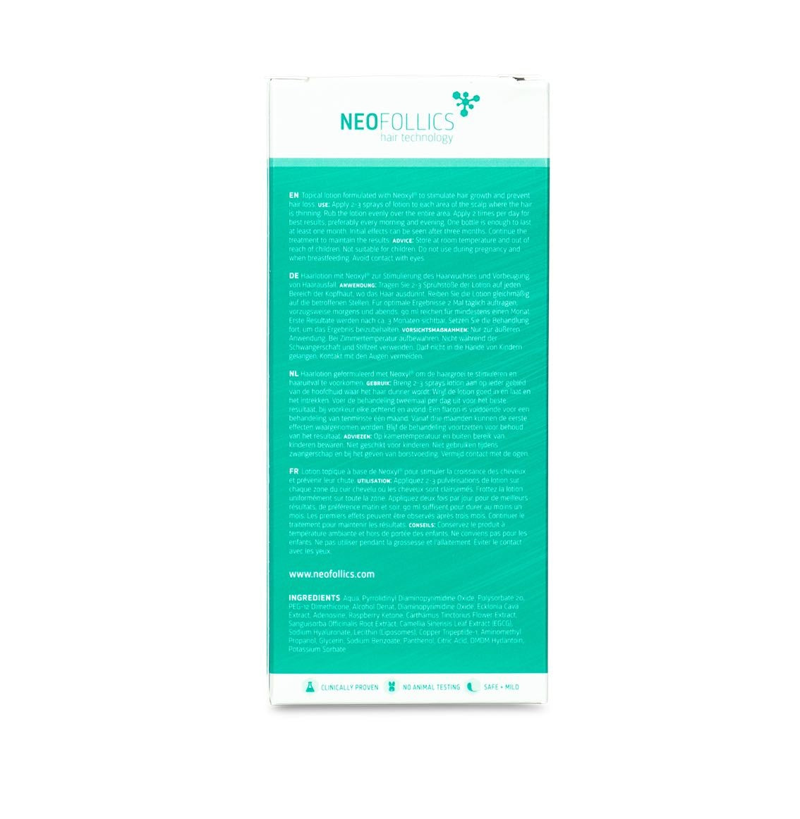 I dag bliver vi mere og mere opmærksomme på, hvad der er i de produkter, vi bruger, og hvordan de produceres. Vi hilser denne udvikling velkommen, da vi naturligvis ønsker det allerbedste for dit hår! Derfor er vi glade for at kunne sige, at Neofollics' produkter ikke er testet på dyr. Alle Neofollics produkter er ikke testet på dyr. Gudskelov :)