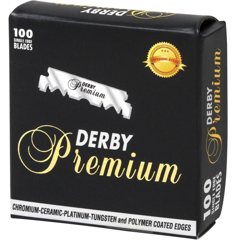Premium Single Edge Blades 100 stk. er specielt designet til barberknive (shavette). Hvert blad er individuelt pakket med en skarphed på 4 på en skala fra 5. Derby-bladene er holdbare og af høj kvalitet; platin, krom, polymer, wolfram og en keramisk belægning. Barberbladene er velegnede til følsom til normal hud og let til kraftig skægvækst.