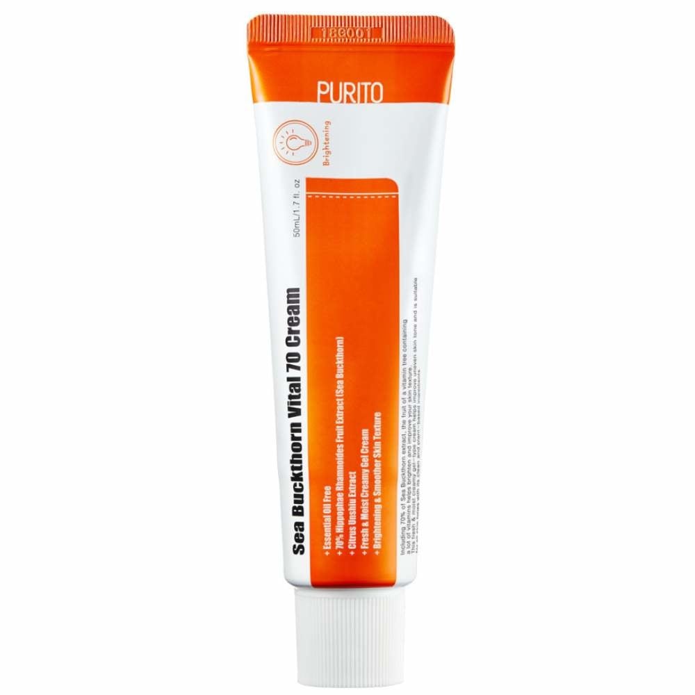 Purito Sea Buckthorn Vital 70 Brightening Cream er en koreansk beroligende ansigtscreme, som beskytter huden mod hudirritation. Cremen er 70 % beriget med havtornekstrakt, der er rig på C-vitamin, som har en beroligende effekt på huden. Resultatet er en fugtet og ensartet hud med en klar teint.