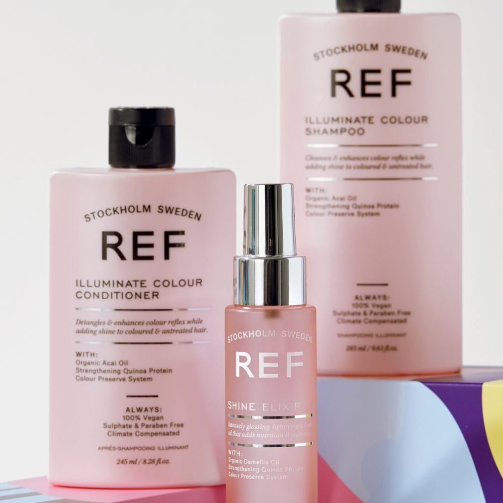 REF Illuminate Colour Giftbox gør dit hår silkeblødt, beskytter og holder farven strålende i længere tid. Resultatet er en frisk, levende hårfarve med en sund glans, der tiltrækker opmærksomhed!