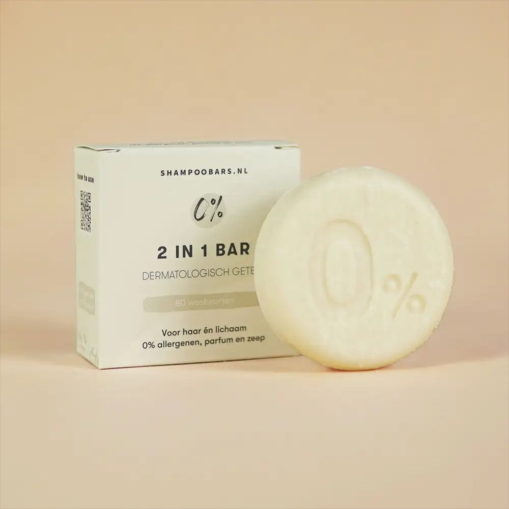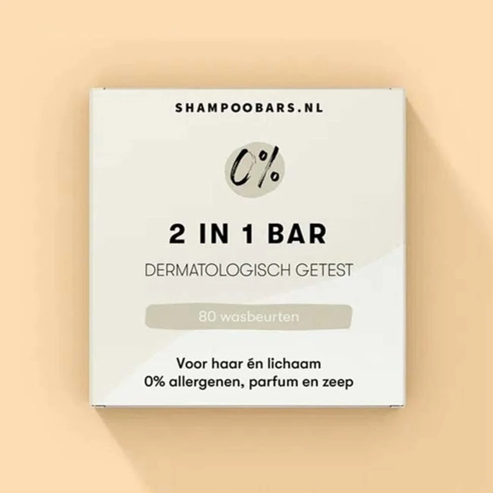 ShampooBars 0% 2-i-1 Bar er den ultimative kombination af shampoo og balsam i én praktisk bar. Denne alsidige bar giver grundig rensning og dyb næring til dit hår, så det føles blødt, skinnende og sundt. Alt dette med 0% allergener, parfume, sæbe og plastik. Så baren er perfekt til dem med følsom hud!