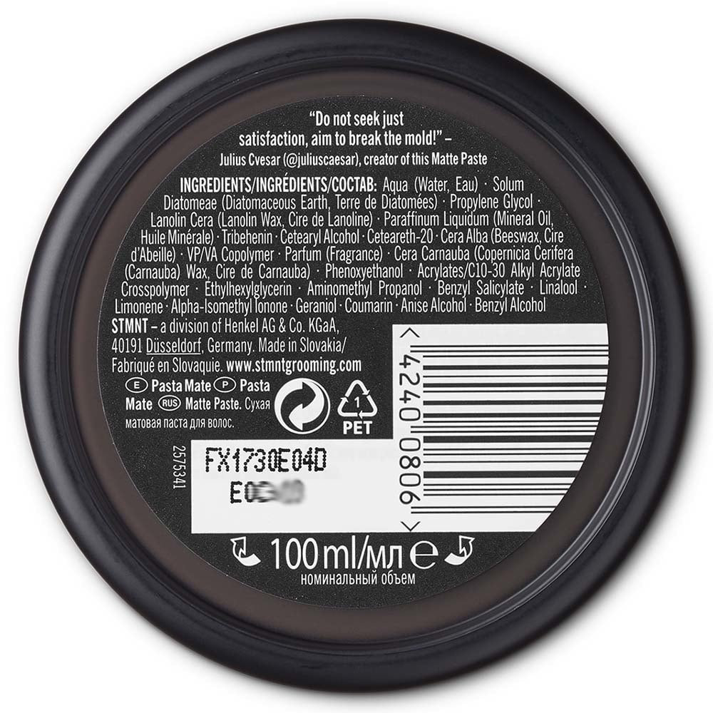 STMNT Grooming Matte Paste is het stylingsproduct met een supermat effect. Breng de Matte Paste aan op vochtig of droog haar voor eenvoudige styling met sterke controle en fixatie. De niet-vette formule zorgt voor een droge definitie met een langhoudende textuur en een matte finish. Door de kenmerkende premium geur van Julius Cvesar: kokosnoot en sandelhout met een vleugje iris, begin jij de dag niet alleen met een frisse look, maar ook met een frisse geur.