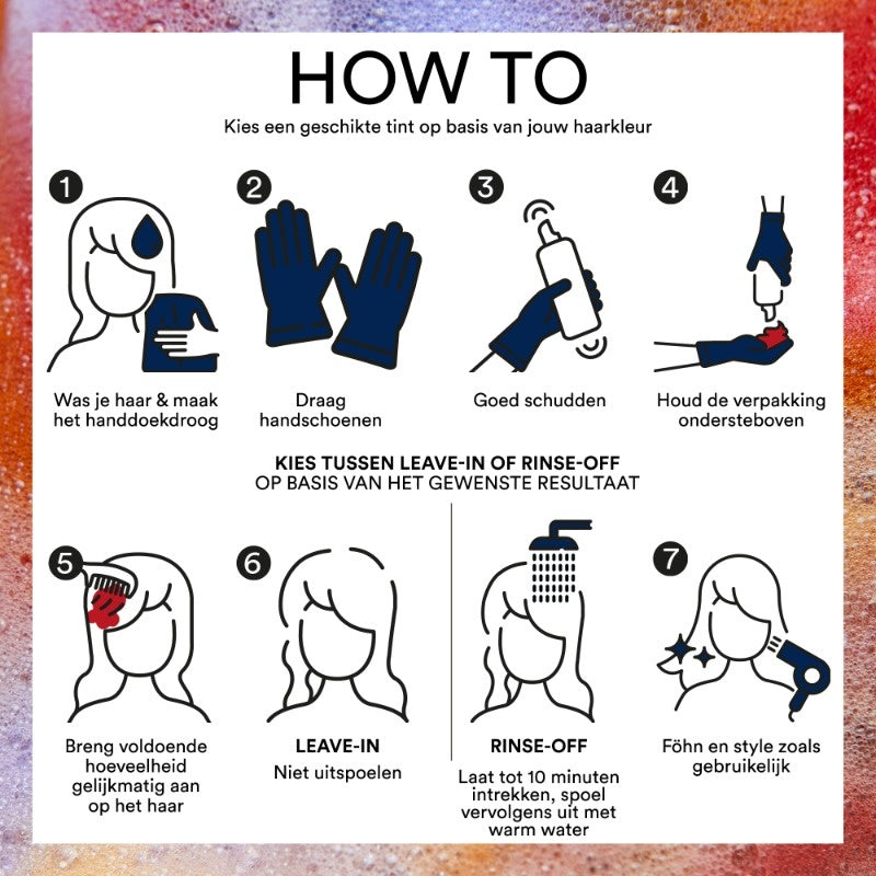 Vask håret, og tør det med et håndklæde, før du bruger Color Style Mousse. Brug altid handsker, og ryst flasken godt før brug. Hold moussen på hovedet, mens du doserer den. Vælg mellem leave-in eller rinse-off baseret på det ønskede resultat. Påfør jævnt nok produkt i håret. Når du bruger leave-in, er det ikke nødvendigt at vaske det ud. Ved rinse-off lader du moussen sidde i op til 10 minutter og skyller derefter med varmt vand. For at opnå optimale farveresultater anbefaler vi, at du ikke vasker håret med shampoo efter farvningen. Til sidst føntørres og styles håret som ønsket.