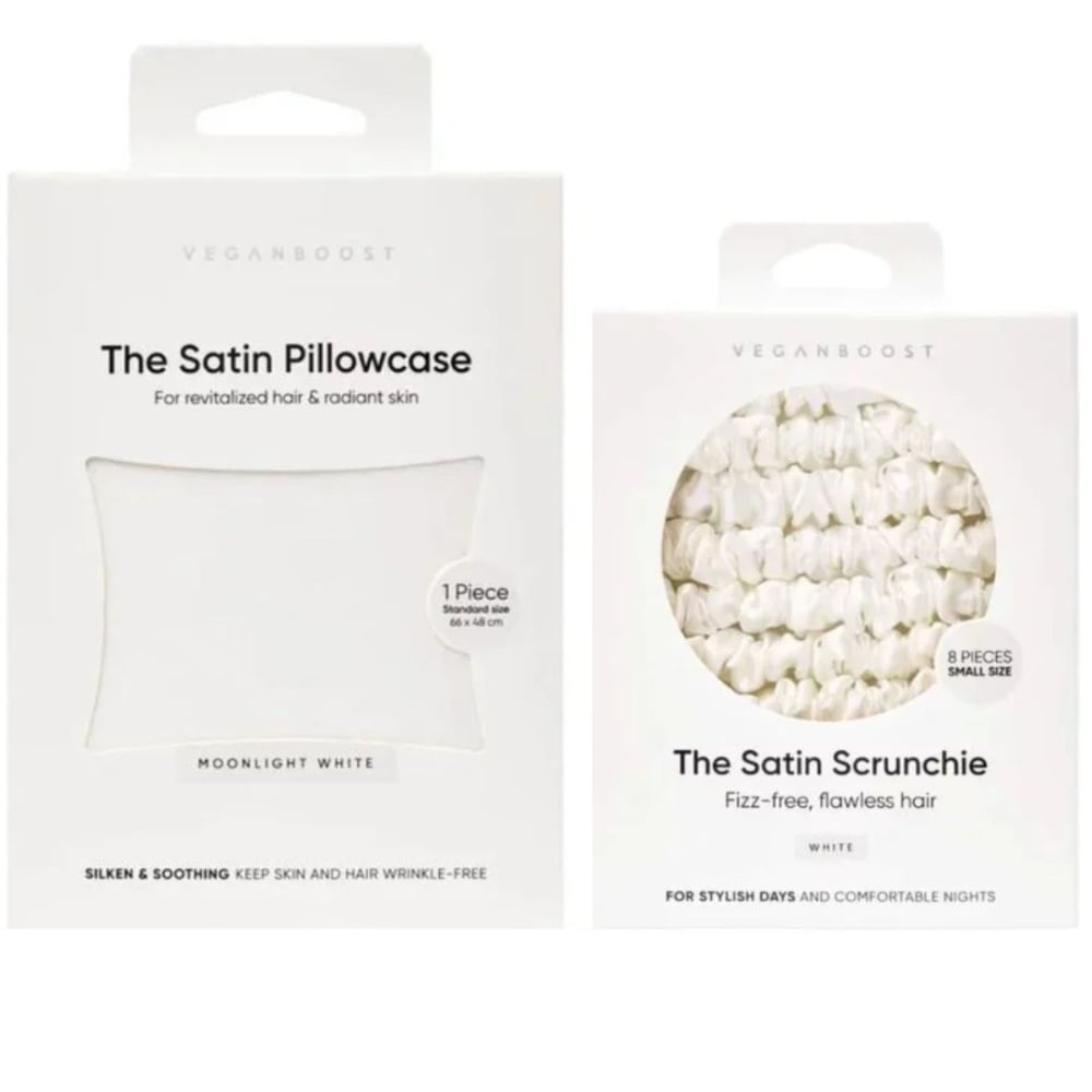 De Veganboost Satin Set White maakt je haar gladder, pluisvrij en glanzend en zorgt voor een uitgeruste, zachte huid. Je kapsel blijft beter in model en je haar voelt gezonder aan, elke ochtend opnieuw.