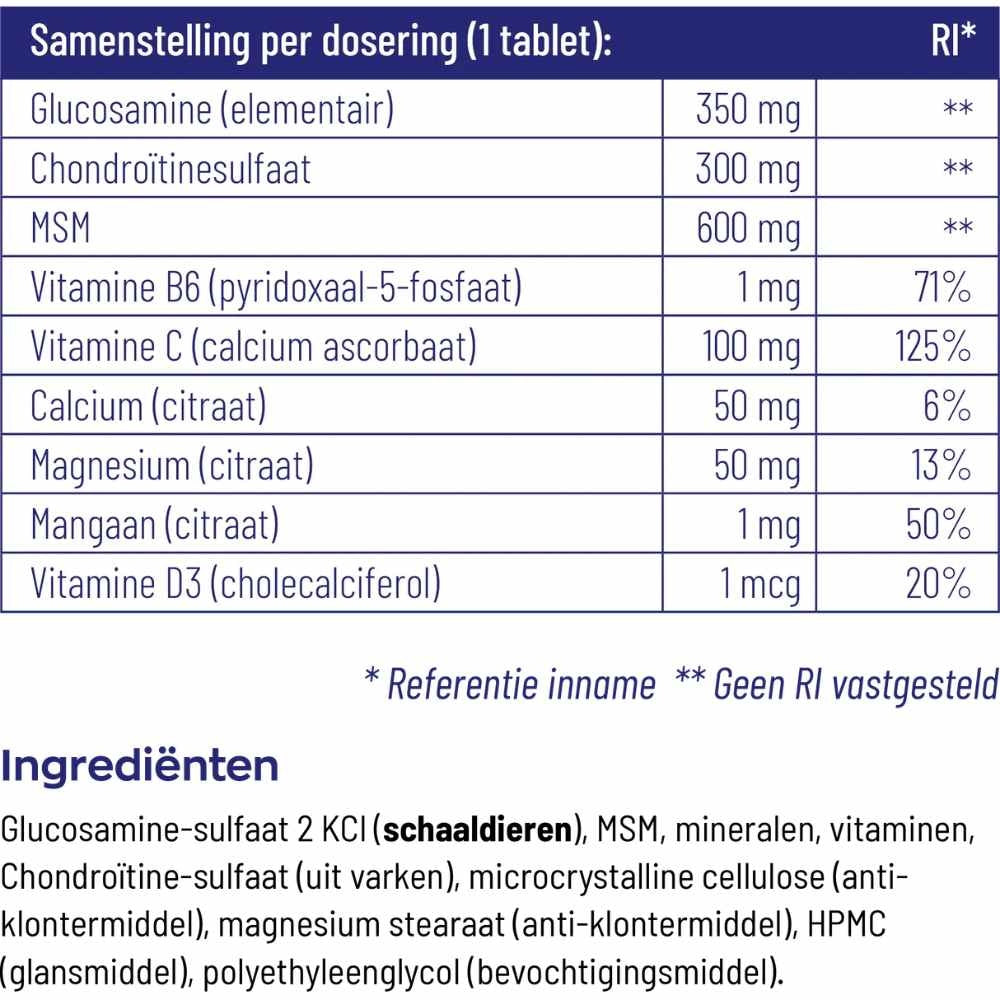 Glucosamine-sulfaat 2 KCl (schaaldieren), MSM, mineralen, vitaminen, Chondroïtine-sulfaat (uit varken), microcrystalline cellulose (anti-klontermiddel), magnesium stearaat (anti-klontermiddel), HPMC (glansmiddel), polyethyleenglycol (bevochtigingsmiddel)