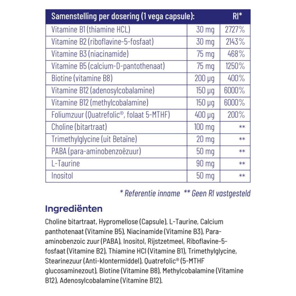 Choline bitartraat, HPMC (Capsule), L-Taurine, Calcium panthotenaat (Vitamine B5), Niacinamide (Vitamine B3), Para-aminobenzoic zuur (PABA), Inositol, Riboflavine-5-fosfaat (Vitamine B2), Thiamine HCl (Vitamine B1), Trimethylglycine, magnesium stearaat (anti-klontermiddel), microcrystalline cellulose (vulstof), silicium dioxide (anti-klontermiddel), Quatrefolic® (5-MTHF glucosaminezout), Biotine (Vitamine B8), Methylcobalamine (Vitamine B12), Adenosylcobalamine (Vitamine B12).